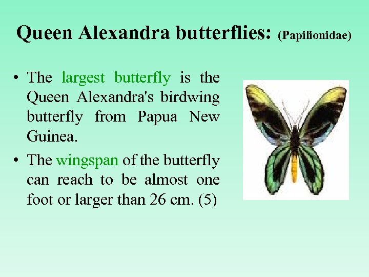 Queen Alexandra butterflies: (Papilionidae) • The largest butterfly is the Queen Alexandra's birdwing butterfly from Papua New Guinea. • The wingspan of the butterfly can reach to be almost one foot or larger than 26 cm. (5)