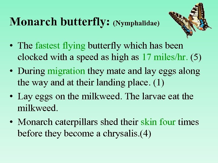 Monarch butterfly: (Nymphalidae) • The fastest flying butterfly which has been clocked with a speed as high as 17 miles/hr. (5) • During migration they mate and lay eggs along the way and at their landing place. (1) • Lay eggs on the milkweed. The larvae eat the milkweed. • Monarch caterpillars shed their skin four times before they become a chrysalis. (4)