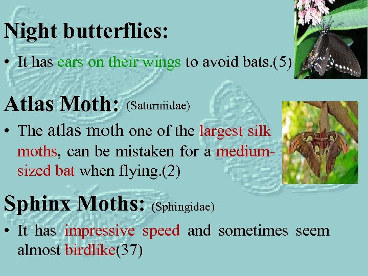 Night butterflies: • It has ears on their wings to avoid bats. (5) Atlas Moth: (Saturniidae) • The atlas moth one of the largest silk moths, can be mistaken for a mediumsized bat when flying. (2) Sphinx Moths: (Sphingidae) • It has impressive speed and sometimes seem almost birdlike(37)