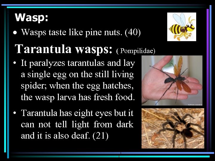 Wasp: Wasps taste like pine nuts. (40) Tarantula wasps: ( Pompilidae) • It paralyzes tarantulas and lay a single egg on the still living spider; when the egg hatches, the wasp larva has fresh food. • Tarantula has eight eyes but it can not tell light from dark and it is also deaf. (21)