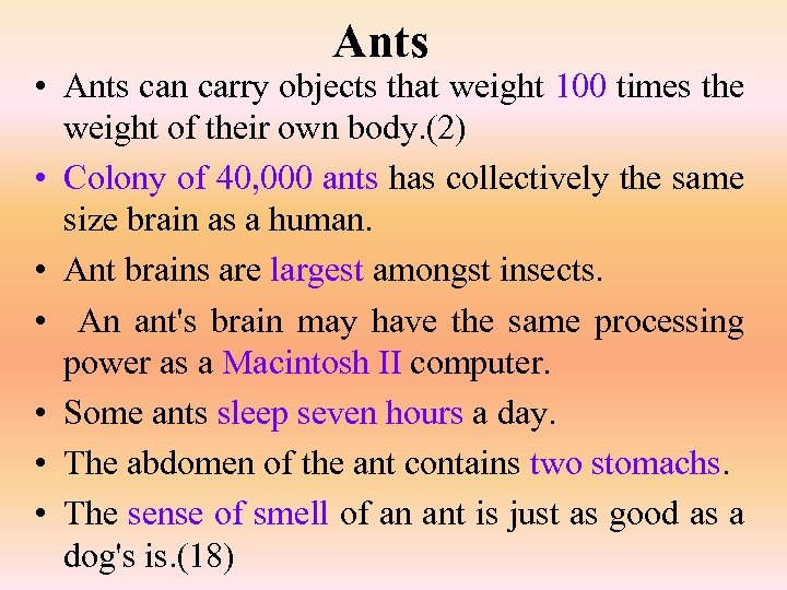 Ants • Ants can carry objects that weight 100 times the weight of their own body. (2) • Colony of 40, 000 ants has collectively the same size brain as a human. • Ant brains are largest amongst insects. • An ant's brain may have the same processing power as a Macintosh II computer. • Some ants sleep seven hours a day. • The abdomen of the ant contains two stomachs. • The sense of smell of an ant is just as good as a dog's is. (18)