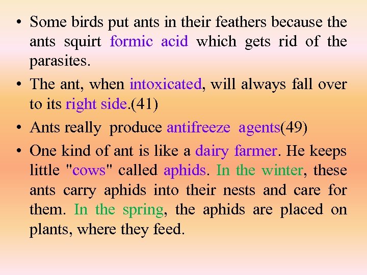 • Some birds put ants in their feathers because the ants squirt formic acid which gets rid of the parasites. • The ant, when intoxicated, will always fall over to its right side. (41) • Ants really produce antifreeze agents(49) • One kind of ant is like a dairy farmer. He keeps little "cows" called aphids. In the winter, these ants carry aphids into their nests and care for them. In the spring, the aphids are placed on plants, where they feed.