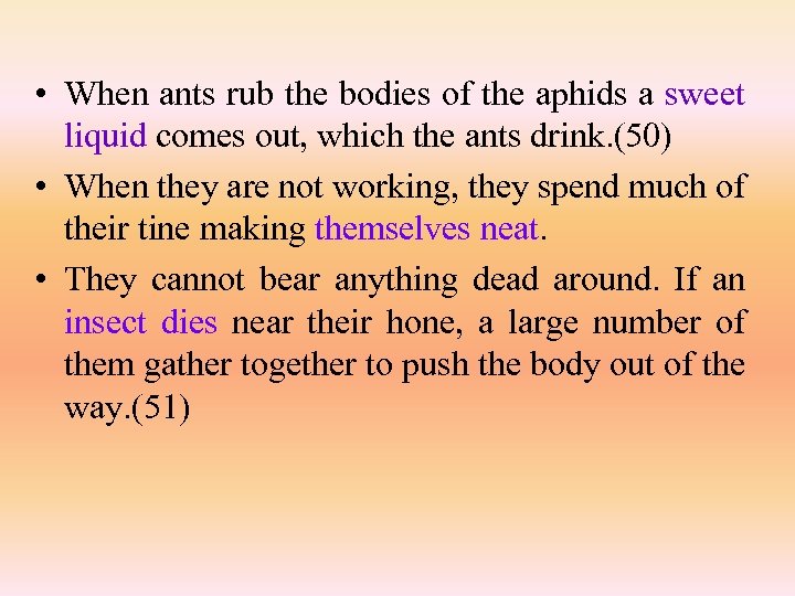 • When ants rub the bodies of the aphids a sweet liquid comes out, which the ants drink. (50) • When they are not working, they spend much of their tine making themselves neat. • They cannot bear anything dead around. If an insect dies near their hone, a large number of them gather together to push the body out of the way. (51)