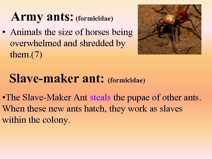 ants: (formicidae) Army • Animals the size of horses being overwhelmed and shredded by them. (7) Slave-maker ant: (formicidae) • The Slave-Maker Ant steals the pupae of other ants. When these new ants hatch, they work as slaves within the colony.