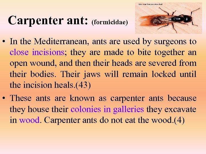 Carpenter ant: (formicidae) • In the Mediterranean, ants are used by surgeons to close incisions; they are made to bite together an open wound, and then their heads are severed from their bodies. Their jaws will remain locked until the incision heals. (43) • These ants are known as carpenter ants because they house their colonies in galleries they excavate in wood. Carpenter ants do not eat the wood. (4)