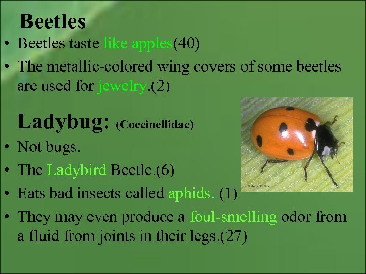 Beetles • Beetles taste like apples(40) • The metallic-colored wing covers of some beetles are used for jewelry. (2) Ladybug: (Coccinellidae) • • Not bugs. The Ladybird Beetle. (6) Eats bad insects called aphids. (1) They may even produce a foul-smelling odor from a fluid from joints in their legs. (27)