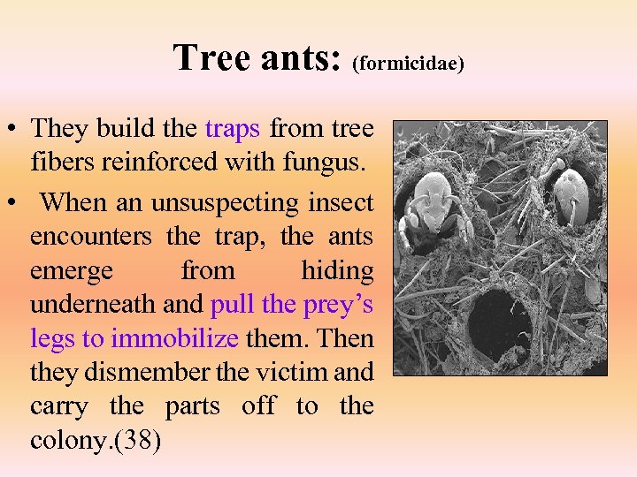Tree ants: (formicidae) • They build the traps from tree fibers reinforced with fungus. • When an unsuspecting insect encounters the trap, the ants emerge from hiding underneath and pull the prey’s legs to immobilize them. Then they dismember the victim and carry the parts off to the colony. (38)