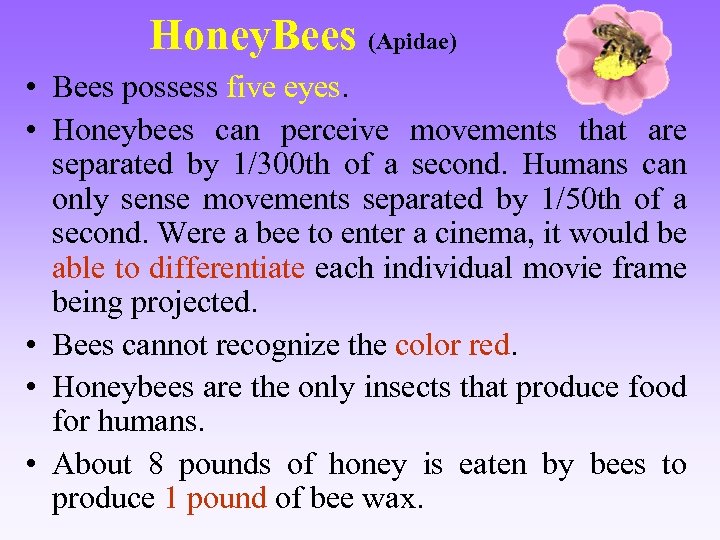 Honey. Bees (Apidae) • Bees possess five eyes. • Honeybees can perceive movements that are separated by 1/300 th of a second. Humans can only sense movements separated by 1/50 th of a second. Were a bee to enter a cinema, it would be able to differentiate each individual movie frame being projected. • Bees cannot recognize the color red. • Honeybees are the only insects that produce food for humans. • About 8 pounds of honey is eaten by bees to produce 1 pound of bee wax.