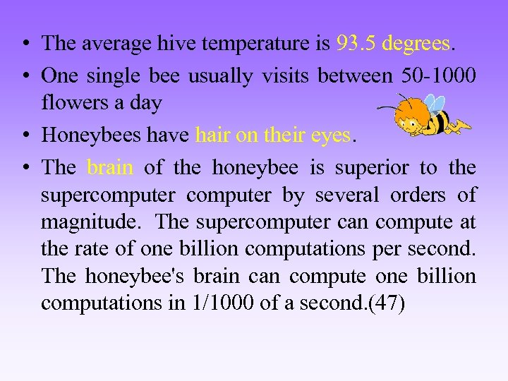 • The average hive temperature is 93. 5 degrees. • One single bee usually visits between 50 -1000 flowers a day • Honeybees have hair on their eyes. • The brain of the honeybee is superior to the supercomputer by several orders of magnitude. The supercomputer can compute at the rate of one billion computations per second. The honeybee's brain can compute one billion computations in 1/1000 of a second. (47)