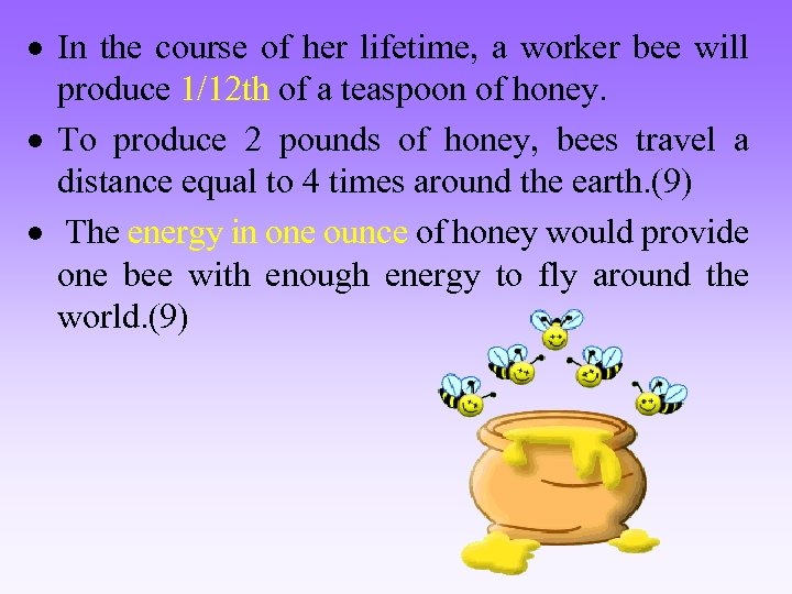 In the course of her lifetime, a worker bee will produce 1/12 th of a teaspoon of honey. To produce 2 pounds of honey, bees travel a distance equal to 4 times around the earth. (9) The energy in one ounce of honey would provide one bee with enough energy to fly around the world. (9)
