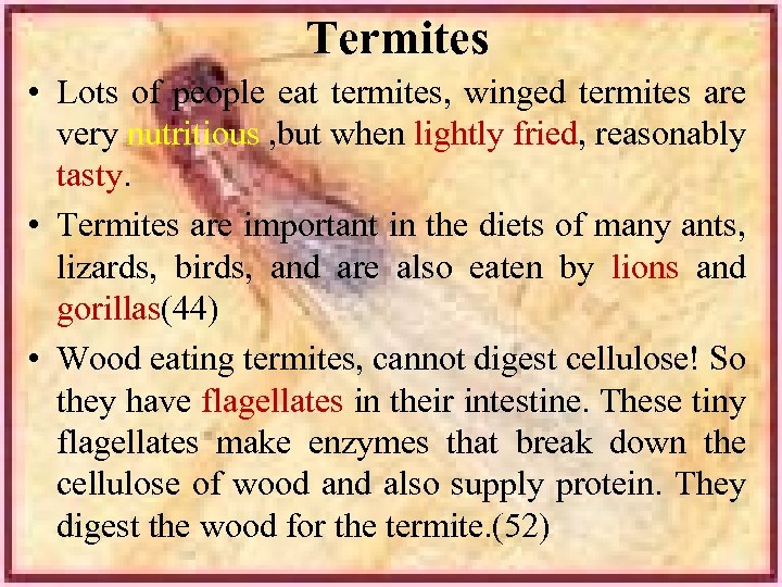Termites • Lots of people eat termites, winged termites are very nutritious , but when lightly fried, reasonably tasty. • Termites are important in the diets of many ants, lizards, birds, and are also eaten by lions and gorillas(44) • Wood eating termites, cannot digest cellulose! So they have flagellates in their intestine. These tiny flagellates make enzymes that break down the cellulose of wood and also supply protein. They digest the wood for the termite. (52)