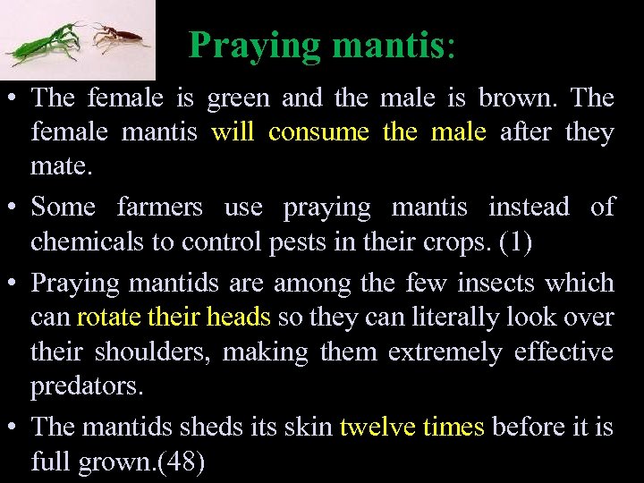 Praying mantis: • The female is green and the male is brown. The female mantis will consume the male after they mate. • Some farmers use praying mantis instead of chemicals to control pests in their crops. (1) • Praying mantids are among the few insects which can rotate their heads so they can literally look over their shoulders, making them extremely effective predators. • The mantids sheds its skin twelve times before it is full grown. (48)