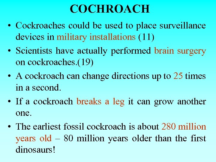 COCHROACH • Cockroaches could be used to place surveillance devices in military installations (11) • Scientists have actually performed brain surgery on cockroaches. (19) • A cockroach can change directions up to 25 times in a second. • If a cockroach breaks a leg it can grow another one. • The earliest fossil cockroach is about 280 million years old – 80 million years older than the first dinosaurs!