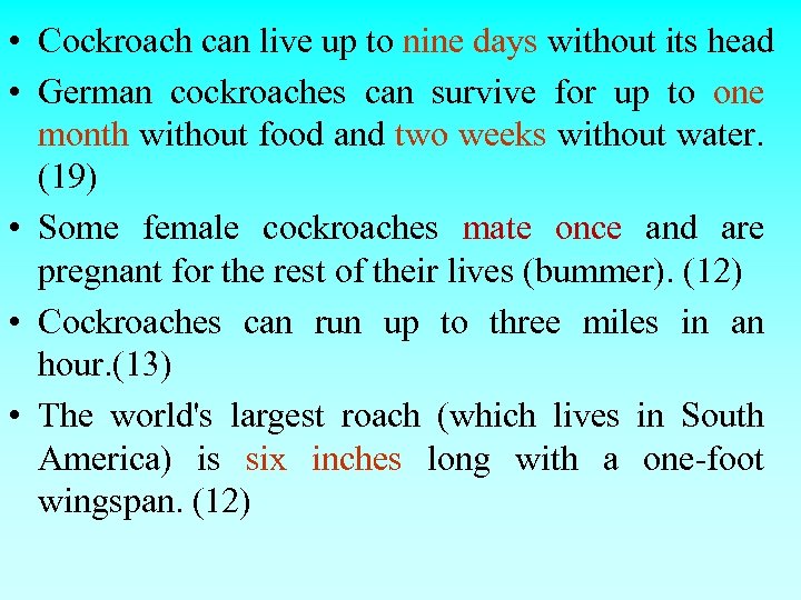 • Cockroach can live up to nine days without its head • German cockroaches can survive for up to one month without food and two weeks without water. (19) • Some female cockroaches mate once and are pregnant for the rest of their lives (bummer). (12) • Cockroaches can run up to three miles in an hour. (13) • The world's largest roach (which lives in South America) is six inches long with a one-foot wingspan. (12)