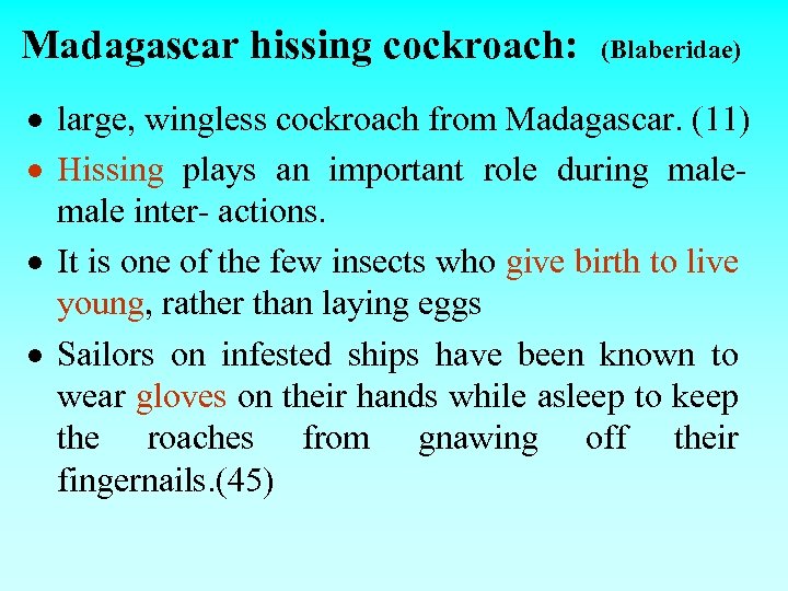 Madagascar hissing cockroach: (Blaberidae) large, wingless cockroach from Madagascar. (11) Hissing plays an important role during male inter- actions. It is one of the few insects who give birth to live young, rather than laying eggs Sailors on infested ships have been known to wear gloves on their hands while asleep to keep the roaches from gnawing off their fingernails. (45)