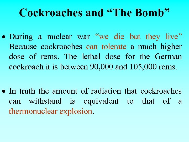 Cockroaches and “The Bomb” During a nuclear war “we die but they live” Because cockroaches can tolerate a much higher dose of rems. The lethal dose for the German cockroach it is between 90, 000 and 105, 000 rems. In truth the amount of radiation that cockroaches can withstand is equivalent to that of a thermonuclear explosion.