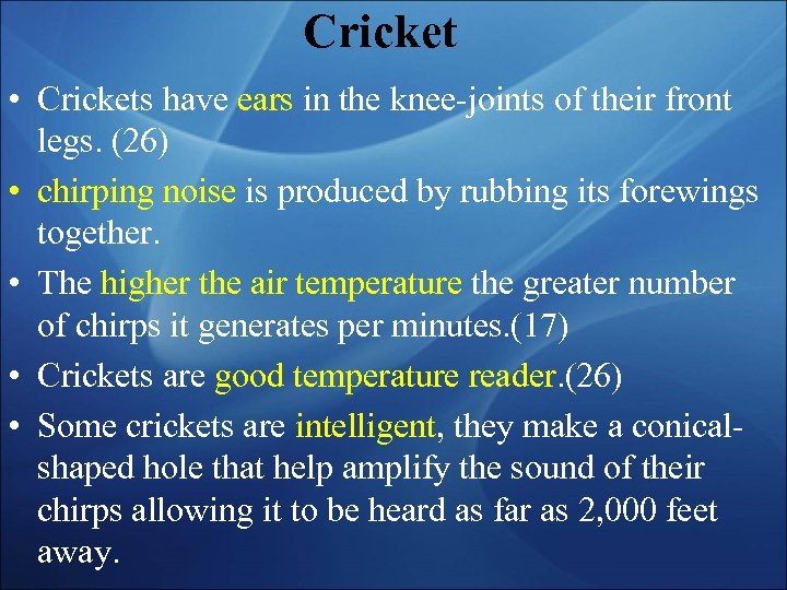 Cricket • Crickets have ears in the knee-joints of their front legs. (26) • chirping noise is produced by rubbing its forewings together. • The higher the air temperature the greater number of chirps it generates per minutes. (17) • Crickets are good temperature reader. (26) • Some crickets are intelligent, they make a conicalshaped hole that help amplify the sound of their chirps allowing it to be heard as far as 2, 000 feet away.