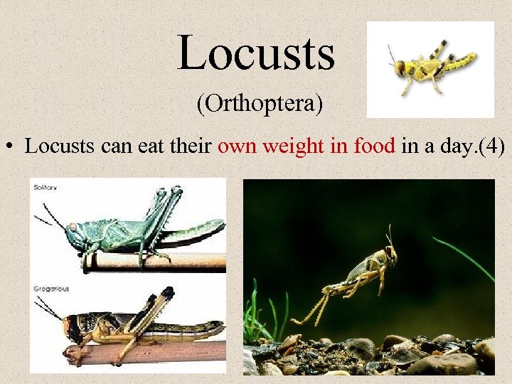Locusts (Orthoptera) • Locusts can eat their own weight in food in a day. (4)