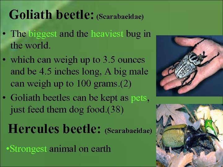 Goliath beetle: (Scarabaeidae) • The biggest and the heaviest bug in the world. • which can weigh up to 3. 5 ounces and be 4. 5 inches long, A big male can weigh up to 100 grams. (2) • Goliath beetles can be kept as pets, just feed them dog food. (38) Hercules beetle: (Scarabaeidae) • Strongest animal on earth