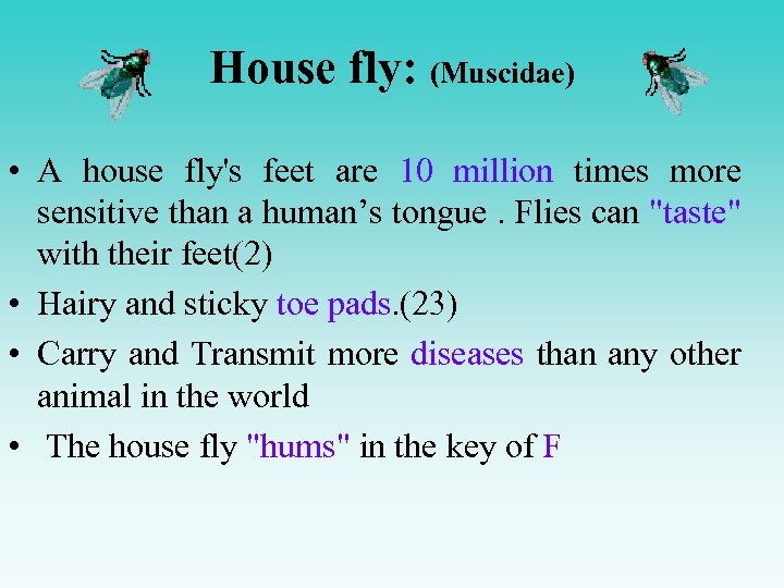 House fly: (Muscidae) • A house fly's feet are 10 million times more sensitive than a human’s tongue. Flies can "taste" with their feet(2) • Hairy and sticky toe pads. (23) • Carry and Transmit more diseases than any other animal in the world • The house fly "hums" in the key of F