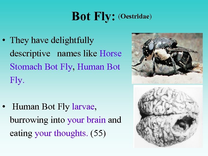 Bot Fly: (Oestridae) • They have delightfully descriptive names like Horse Stomach Bot Fly, Human Bot Fly. • Human Bot Fly larvae, burrowing into your brain and eating your thoughts. (55)