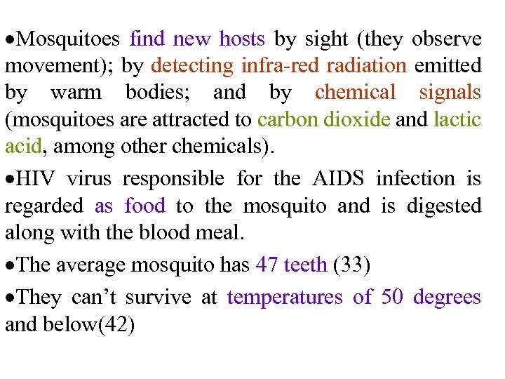 Mosquitoes find new hosts by sight (they observe movement); by detecting infra-red radiation emitted by warm bodies; and by chemical signals (mosquitoes are attracted to carbon dioxide and lactic acid, among other chemicals). HIV virus responsible for the AIDS infection is regarded as food to the mosquito and is digested along with the blood meal. The average mosquito has 47 teeth (33) They can’t survive at temperatures of 50 degrees and below(42)
