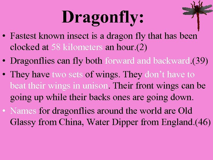 Dragonfly: • Fastest known insect is a dragon fly that has been clocked at 58 kilometers an hour. (2) • Dragonflies can fly both forward and backward. (39) • They have two sets of wings. They don’t have to beat their wings in unison. Their front wings can be going up while their backs ones are going down. • Names for dragonflies around the world are Old Glassy from China, Water Dipper from England. (46)