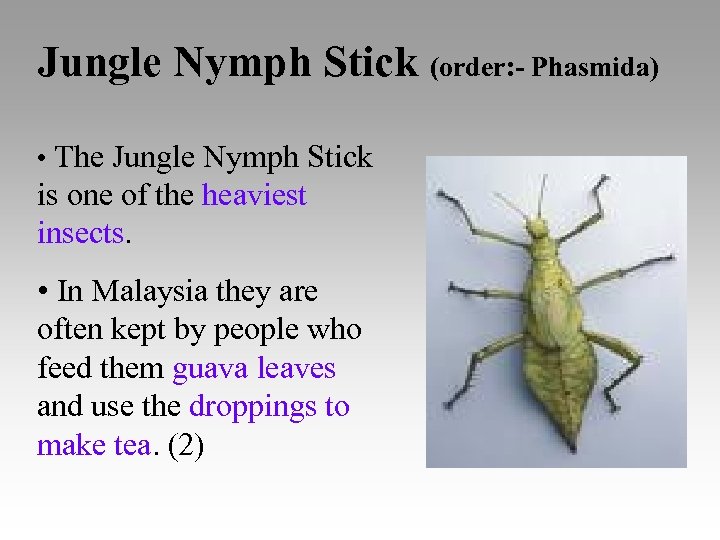 Jungle Nymph Stick (order: - Phasmida) • The Jungle Nymph Stick is one of the heaviest insects. • In Malaysia they are often kept by people who feed them guava leaves and use the droppings to make tea. (2)