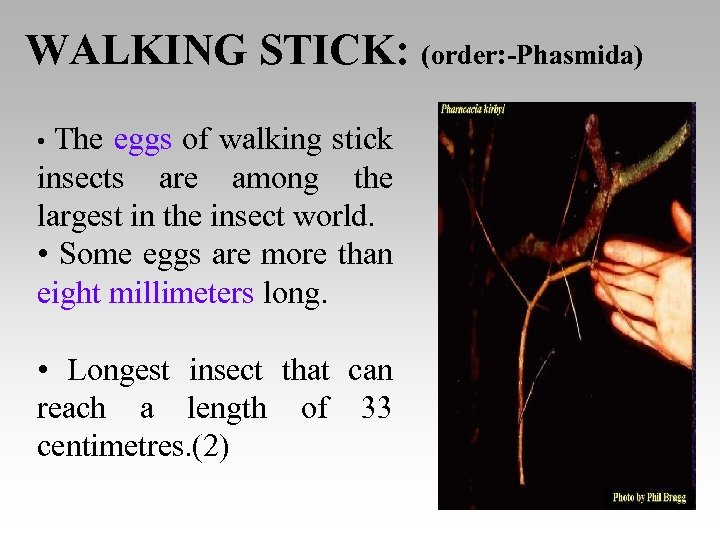 WALKING STICK: (order: -Phasmida) • The eggs of walking stick insects are among the largest in the insect world. • Some eggs are more than eight millimeters long. • Longest insect that can reach a length of 33 centimetres. (2)