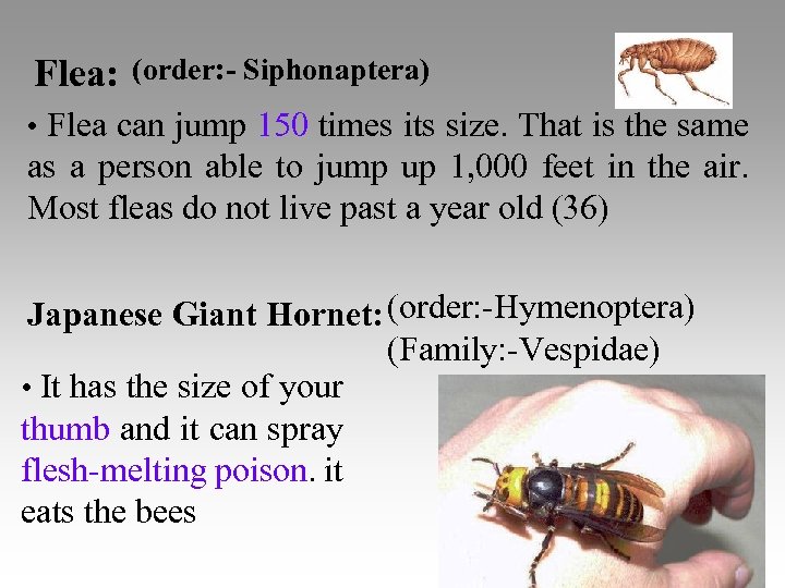 Flea: (order: - Siphonaptera) • Flea can jump 150 times its size. That is the same as a person able to jump up 1, 000 feet in the air. Most fleas do not live past a year old (36) Japanese Giant Hornet: (order: -Hymenoptera) (Family: -Vespidae) • It has the size of your thumb and it can spray flesh-melting poison. it eats the bees