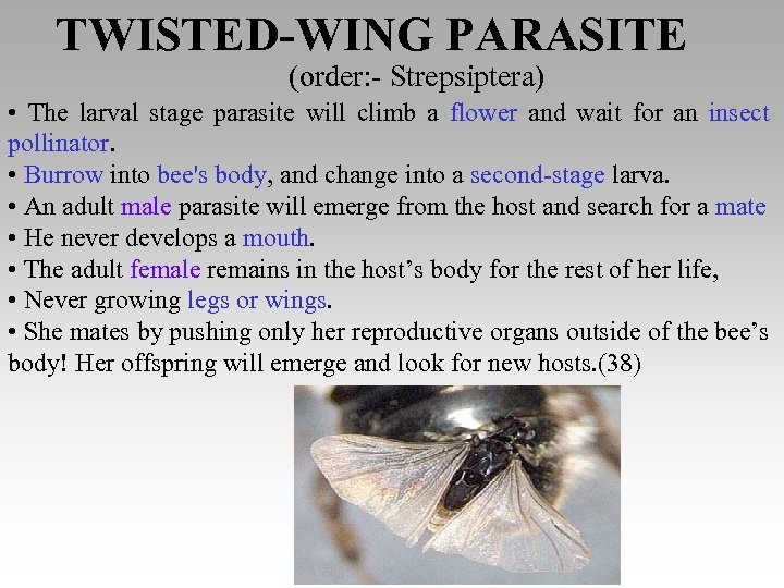 TWISTED-WING PARASITE (order: - Strepsiptera) • The larval stage parasite will climb a flower and wait for an insect pollinator. • Burrow into bee's body, and change into a second-stage larva. • An adult male parasite will emerge from the host and search for a mate • He never develops a mouth. • The adult female remains in the host’s body for the rest of her life, • Never growing legs or wings. • She mates by pushing only her reproductive organs outside of the bee’s body! Her offspring will emerge and look for new hosts. (38)