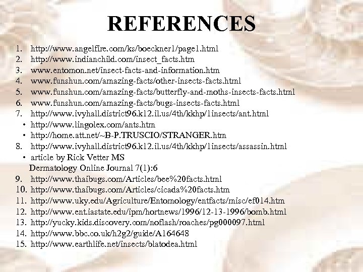 REFERENCES 1. http: //www. angelfire. com/ks/boeckner 1/page 1. html 2. http: //www. indianchild. com/insect_facts. htm 3. www. entomon. net/insect-facts-and-information. htm 4. www. funshun. com/amazing-facts/other-insects-facts. html 5. www. funshun. com/amazing-facts/butterfly-and-moths-insects-facts. html 6. www. funshun. com/amazing-facts/bugs-insects-facts. html 7. http: //www. ivyhall. district 96. k 12. il. us/4 th/kkhp/1 insects/ant. html • http: //www. lingolex. com/ants. htm • http: //home. att. net/~B-P. TRUSCIO/STRANGER. htm 8. http: //www. ivyhall. district 96. k 12. il. us/4 th/kkhp/1 insects/assassin. html • article by Rick Vetter MS Dermatology Online Journal 7(1): 6 9. http: //www. thaibugs. com/Articles/bee%20 facts. html 10. http: //www. thaibugs. com/Articles/cicada%20 facts. htm 11. http: //www. uky. edu/Agriculture/Entomology/entfacts/misc/ef 014. htm 12. http: //www. ent. iastate. edu/ipm/hortnews/1996/12 -13 -1996/bomb. html 13. http: //yucky. kids. discovery. com/noflash/roaches/pg 000097. html 14. http: //www. bbc. co. uk/h 2 g 2/guide/A 164648 15. http: //www. earthlife. net/insects/blatodea. html