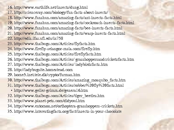 16. http: //www. earthlife. net/insects/dung. html 17. http: //scienceray. com/biology/fun-facts-about-insects/ 18. http: //www. funshun. com/amazing-facts/ant-insects-facts. html 19. http: //www. funshun. com/amazing-facts/cockroach-insects-facts. html 20. http: //www. funshun. com/amazing-facts/bee-insects-facts. html 21. http: //www. funshun. com/amazing-facts/wasp-insects-facts. html 22. http: //edis. ifas. ufl. edu/in 758 23. http: //www. thaibugs. com/Articles/flyfacts. htm 24. http: //www. firefly-selangor-msia. com/firefly. htm 25. http: //www. thaibugs. com/Articles/fireflyfacts. htm 26. http: //www. thaibugs. com/Articles/ grasshoppersandcricketsfacts. htm 27. http: //www. thaibugs. com/Articles/ ladybirdsfacts. htm 28. http: //ladybugsite. homestead. com 29. home 5. inet. tele. dk/crypto/furman. htm 30. http: //www. thaibugs. com/Articles/amazing_mosquito_facts. htm 31. http: //www. thaibugs. com/Articles/robber%20 fly%20 facts. html • http: //www. geller-grimm. de/genera 16. htm 32. http: //www. thaibugs. com/Articles/tiger_beetles. htm 33. http: //www. planet-pets. com/didyoui. htm 34. http: //www. entomon. net/orthoptera-grasshoppers-crickets. htm 35. http: //www. interestingfacts. org/fact/insects-in-your-chocolate