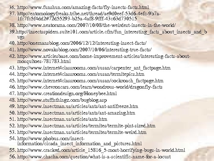 36. http: //www. funshun. com/amazing-facts/fly-insects-facts. html 37. http: //entomologyfreaks. tribe. net/thread/ae 9 d 0 eef-53 d 6 -4 efc-9 b 7 a 1 fc 7 fc 5 f 4 dd 2#72 d 55293 -b 25 a-4 af 8 -9 fff-43 c 63 d 730515 38. http: //www. neatorama. com/2007/10/08/the-weirdest-insects-in-the-world/ 39. http: //insectsspiders. suite 101. com/article. cfm/fun_interesting_facts_about_insects_and_b ugs 40. http: //onemansblog. com/2006/12/12/interesting-insect-facts/ 41. http: //www. novaksblog. com/2007/10/06/interesting-true-facts/ 42. http: //www. articlesbase. com/home-improvement-articles/interesting-facts-aboutmosquitoes-781783. html 43. http: //www. internet 4 classrooms. com/susan/carpenter_ant_factpage. htm 44. http: //www. internet 4 classrooms. com/susan/termitepics. htm 45. http: //www. internet 4 classrooms. com/susan/cockroach_factpage. htm 46. http: //www. chevroncars. com/learn/wondrous-world/dragonfly-facts 47. http: //www. creationdesign. org/Honeybee. html 48. http: //www. stuffnthingz. com/bugblog. asp 49. http: //www. insectman. us/articles/ant-antifreeze. htm 50. http: //www. insectman. us/articles/ant-amazing. htm 51. http: //www. insectman. us/articles/ants. htm 52. http: //www. insectman. us/articles/termite-pint-sized. htm 53. http: //www. insectman. us/articles/termite-weird. htm 54. http: //www. phobus. com/insectinformation/cicada_insect_information_and_pictures. html 55. http: //www. cracked. com/article_15816_5 -most-horrifying-bugs-in-world. html 56. http: //www. chacha. com/question/what-is-a-scientific-name-for-a-locust
