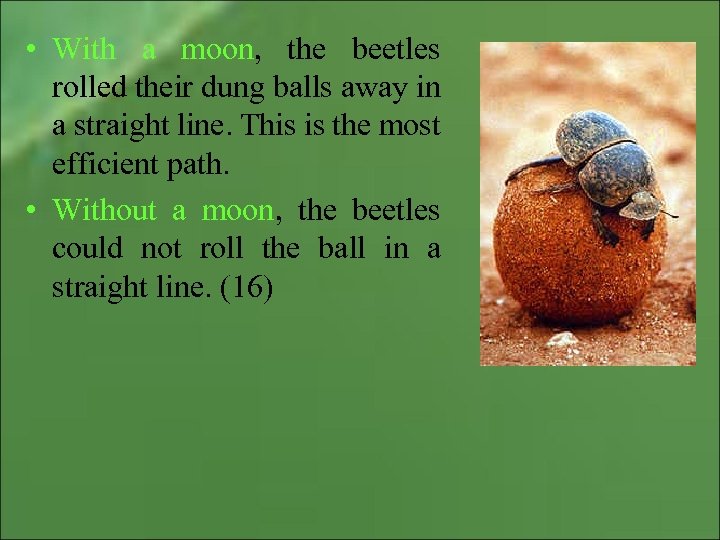 • With a moon, the beetles rolled their dung balls away in a straight line. This is the most efficient path. • Without a moon, the beetles could not roll the ball in a straight line. (16)