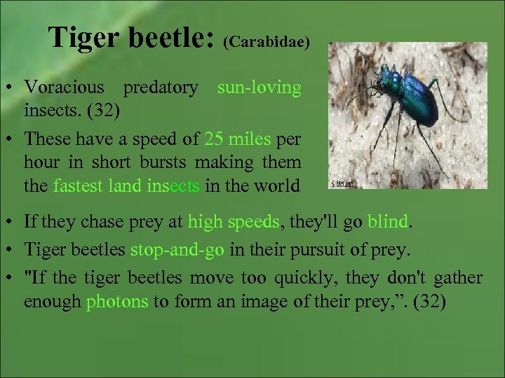Tiger beetle: (Carabidae) • Voracious predatory sun-loving insects. (32) • These have a speed of 25 miles per hour in short bursts making them the fastest land insects in the world • If they chase prey at high speeds, they'll go blind. • Tiger beetles stop-and-go in their pursuit of prey. • "If the tiger beetles move too quickly, they don't gather enough photons to form an image of their prey, ”. (32)
