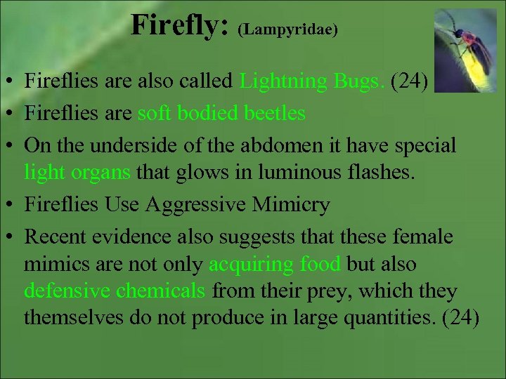 Firefly: (Lampyridae) • Fireflies are also called Lightning Bugs. (24) • Fireflies are soft bodied beetles • On the underside of the abdomen it have special light organs that glows in luminous flashes. • Fireflies Use Aggressive Mimicry • Recent evidence also suggests that these female mimics are not only acquiring food but also defensive chemicals from their prey, which they themselves do not produce in large quantities. (24)