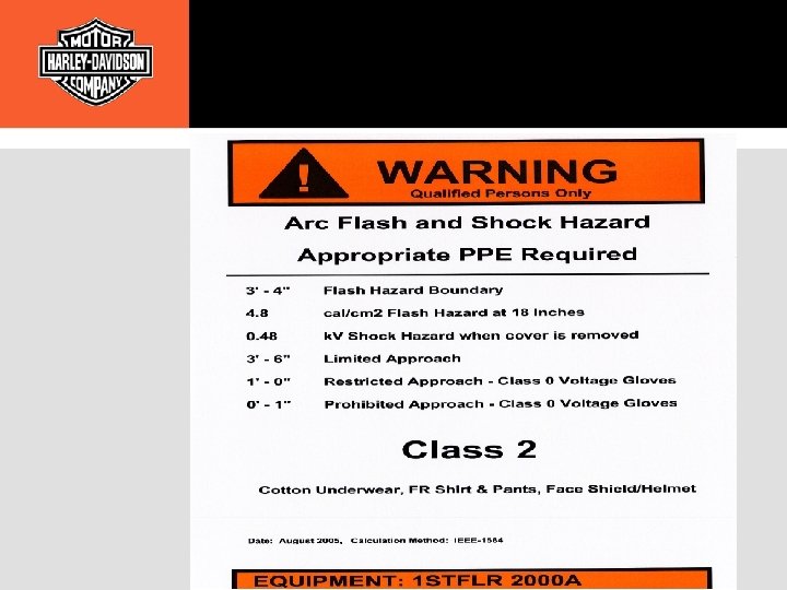 NFPA 70 E • Managing ARC Flash – Arc flash hazard analysis has been performed at the H-D facility to: • Comply with NFPA 70 E standard • Determine arc flash boundaries • Determine required level of Personal Protective Equipment (PPE) to protect personnel • Working with Energized Circuits – Only “Qualified” personnel are permitted to work on energized electrical equipment. – If work must be performed on electrical conductors or parts that are not placed in an electrically safe work condition, an Energized Electrical Work Permit must be completed prior to performing any work beyond voltage testing and trouble-shooting. – Definition: A qualified person is one who has the technical skills and knowledge related to the construction and operation of the electrical equipment and installations and has received safety training to recognize and avoid the electrical hazards.