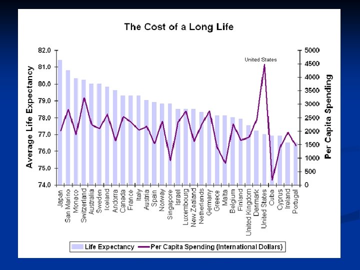 The highest spending country n Health care spending in economicallyadvanced democracies US $7, 290/capita Switzerland 61% of US Canada 53% of US Germany 49% of US Japan 35% of US New Zealand 34% of US n OECD 16% of GDP 67% of US 63% of US 65% of US 51% of US 57% of US Health Data 2009 (2007 data except 2006 for Japan)