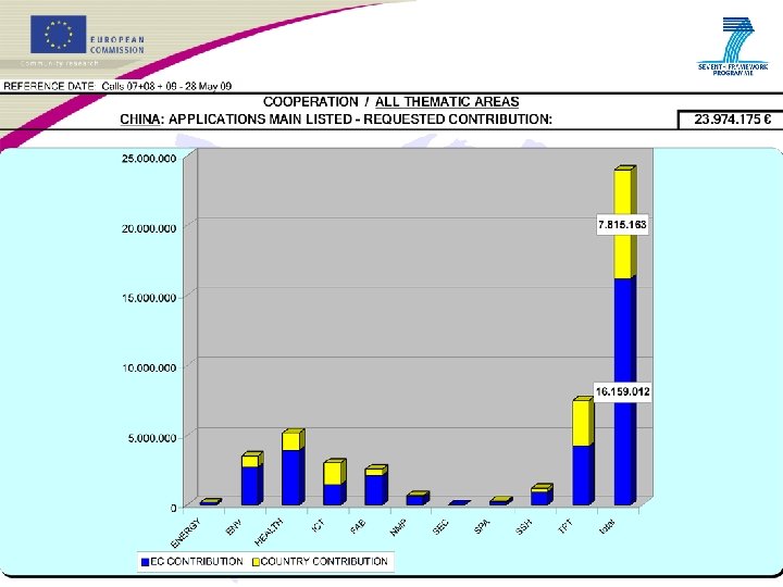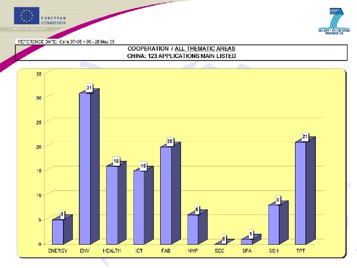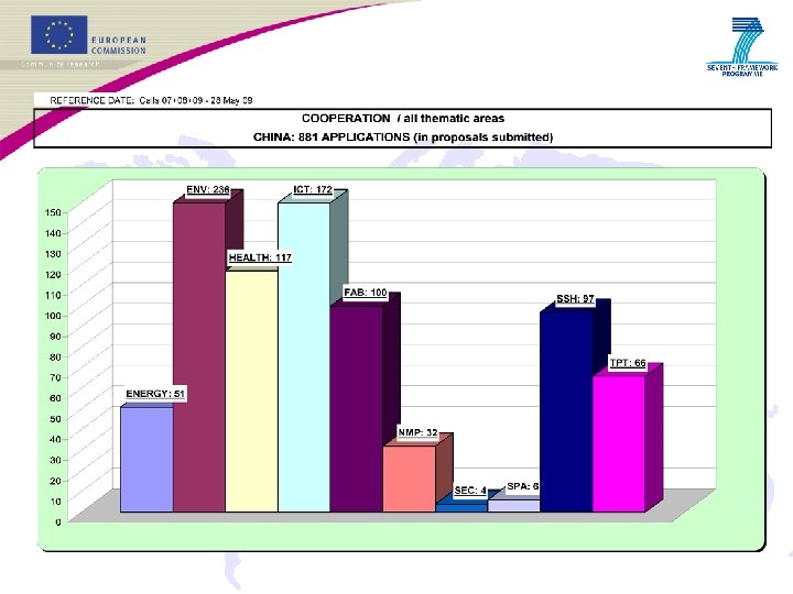 EU – CHINA Science & Technology Agreement • Signed in 1998 renewed in 2004 • Regular Joint Steering Committee meetings to define common priorities • More balanced and equal participation • More strategic cooperation based on common interest through the principles of: in Beijing November 2007) (Concept agreed at JSC meeting 1. Co-decision to launch projects in areas which are high on the agenda of both EU and China 2. Co-selection of balanced groups of EU China research teams 3. Co-funding of projects • Coordinated calls at the study to be inserted in 2010 WPs • Priority areas of cooperation: – – – Health (i. e. infectious diseases, diabetes, etc. ) Energy/Climate Change/Emission reduction and environmental protection Biotechnology and food (food safety, animal health, etc. )