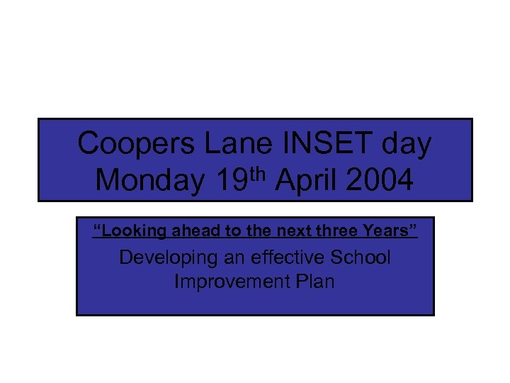 Coopers Lane INSET day th April 2004 Monday 19 “Looking ahead to the next three Years” Developing an effective School Improvement Plan