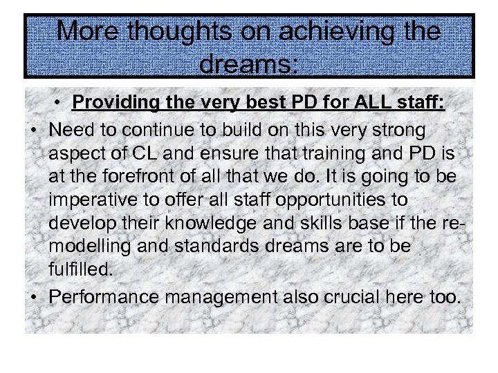 More thoughts on achieving the dreams: • Providing the very best PD for ALL staff: • Need to continue to build on this very strong aspect of CL and ensure that training and PD is at the forefront of all that we do. It is going to be imperative to offer all staff opportunities to develop their knowledge and skills base if the remodelling and standards dreams are to be fulfilled. • Performance management also crucial here too.