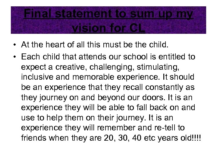 Final statement to sum up my vision for CL • At the heart of all this must be the child. • Each child that attends our school is entitled to expect a creative, challenging, stimulating, inclusive and memorable experience. It should be an experience that they recall constantly as they journey on and beyond our doors. It is an experience they will be able to fall back on and use to help them on their journey. It is an experience they will remember and re-tell to friends when they are 20, 30, 40 etc years old!!!!