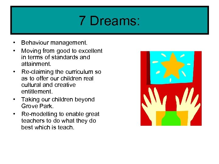 7 Dreams: • Behaviour management. • Moving from good to excellent in terms of standards and attainment. • Re-claiming the curriculum so as to offer our children real cultural and creative entitlement. • Taking our children beyond Grove Park. • Re-modelling to enable great teachers to do what they do best which is teach.