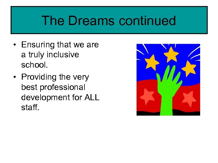 The Dreams continued • Ensuring that we are a truly inclusive school. • Providing the very best professional development for ALL staff.