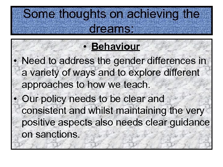 Some thoughts on achieving the dreams: • Behaviour • Need to address the gender differences in a variety of ways and to explore different approaches to how we teach. • Our policy needs to be clear and consistent and whilst maintaining the very positive aspects also needs clear guidance on sanctions.