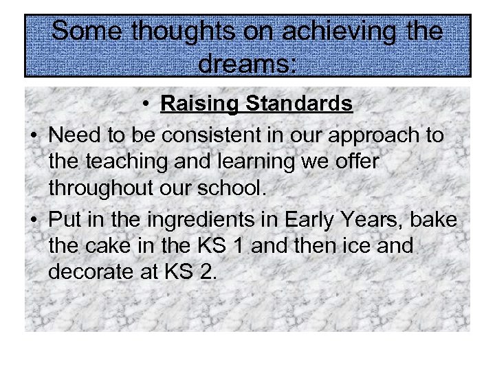 Some thoughts on achieving the dreams: • Raising Standards • Need to be consistent in our approach to the teaching and learning we offer throughout our school. • Put in the ingredients in Early Years, bake the cake in the KS 1 and then ice and decorate at KS 2.