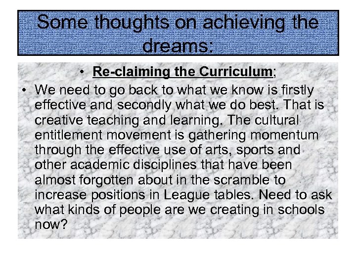 Some thoughts on achieving the dreams: • Re-claiming the Curriculum; • We need to go back to what we know is firstly effective and secondly what we do best. That is creative teaching and learning. The cultural entitlement movement is gathering momentum through the effective use of arts, sports and other academic disciplines that have been almost forgotten about in the scramble to increase positions in League tables. Need to ask what kinds of people are we creating in schools now?