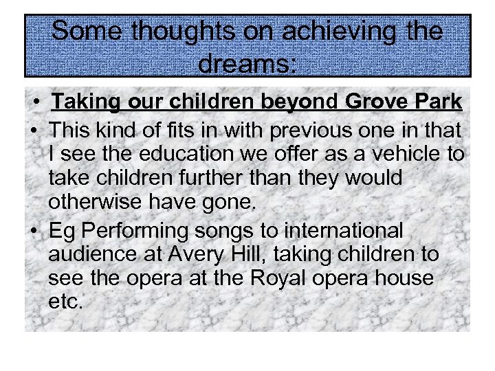 Some thoughts on achieving the dreams: • Taking our children beyond Grove Park • This kind of fits in with previous one in that I see the education we offer as a vehicle to take children further than they would otherwise have gone. • Eg Performing songs to international audience at Avery Hill, taking children to see the opera at the Royal opera house etc.