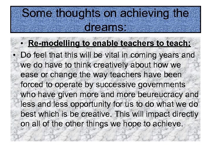 Some thoughts on achieving the dreams: • Re-modelling to enable teachers to teach; • Do feel that this will be vital in coming years and we do have to think creatively about how we ease or change the way teachers have been forced to operate by successive governments who have given more and more beureucracy and less opportunity for us to do what we do best which is be creative. This will impact directly on all of the other things we hope to achieve.